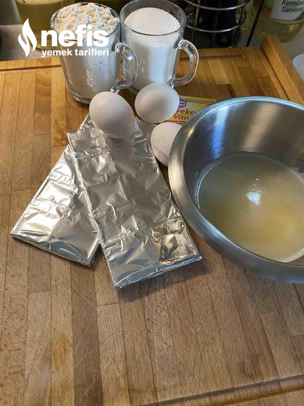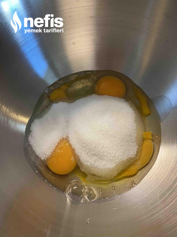 - Ayrı bir kapta 3 yumurta ve 1 su bardağı şekeri güzelce çırpalım.