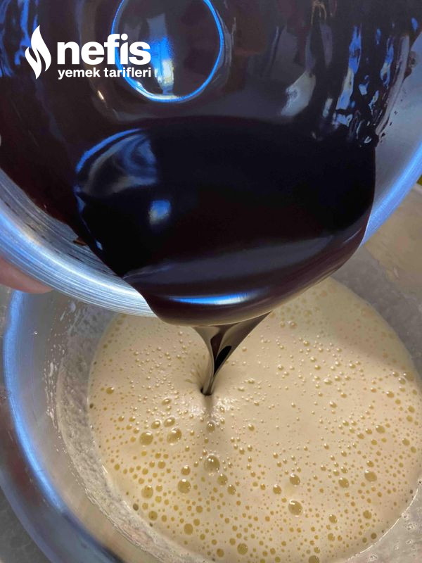 - Erimiş çikolatayı da içine katarak çırpmaya devam edelim.