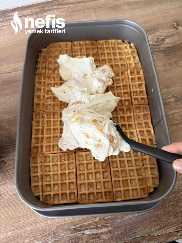 - Kremanın üzerine büsbütün wafle yerleştirip 3 saat buzdolabına kaldırın.