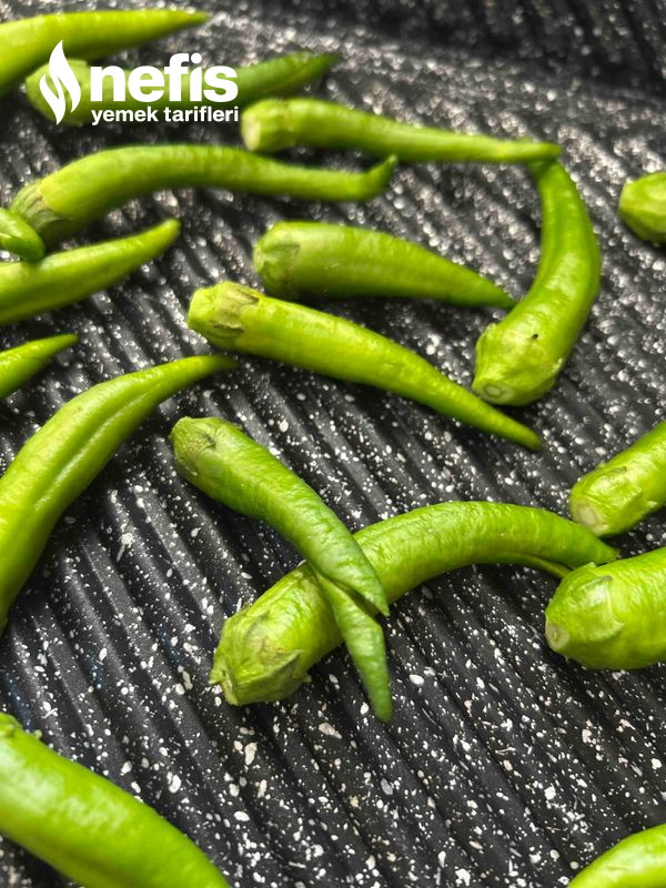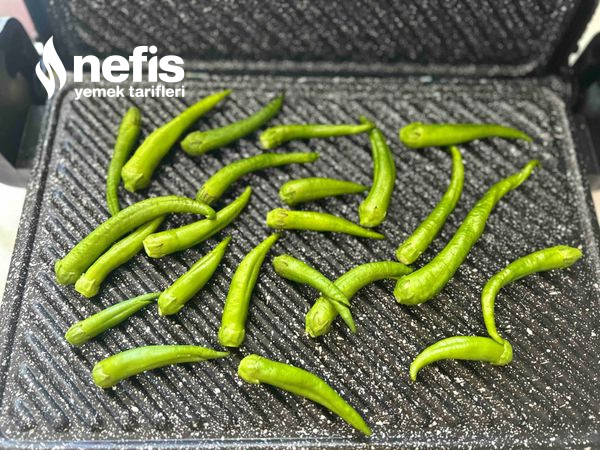 1. Sivri biberleri tost makinesinde közlüyoruz ,arnavut biberlerin sap kısımlarını kesip içine su girmesi için parmak ucumuzla eziyoruz.