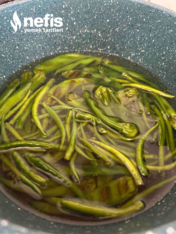 2. Ocağa su,sirke,yağ,şeker,tuz,limon tuzunu alıyoruz şeker eriyince biberleri döküp bir taşım kaynatıyoruz.