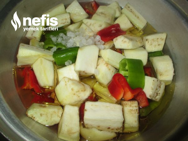 - Patlıcanları bütün soyalım iri küp doğrayalım ,tuzlu suda beş dakika patlıcanları bekletelim.