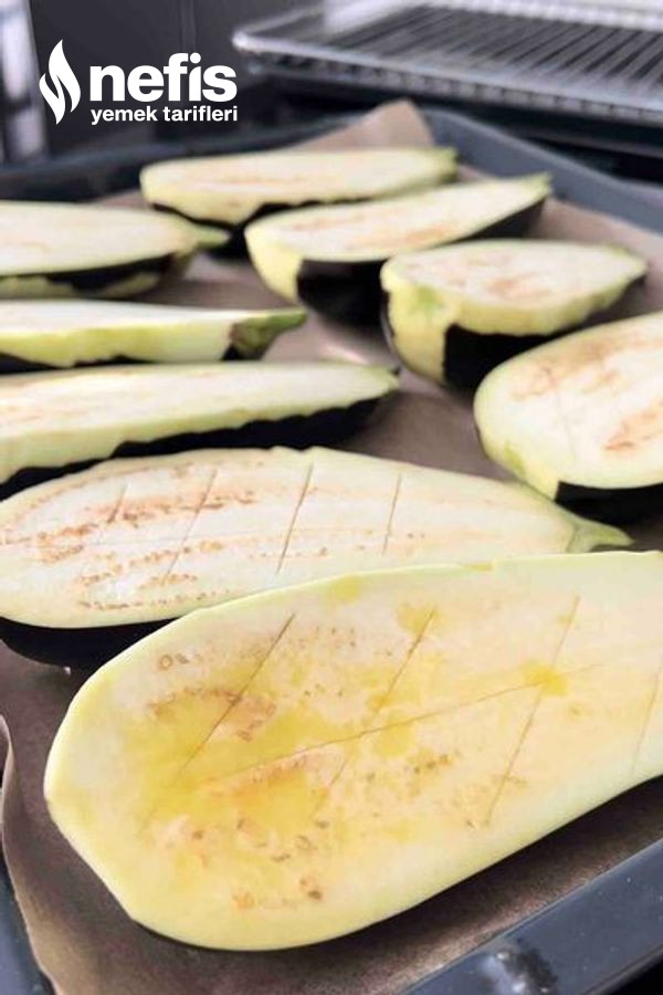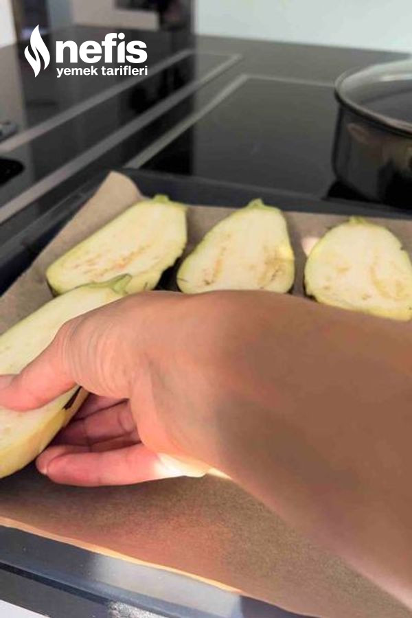 1. Patlıcanları alacalı formda soyup ortadan uzunlamasına ikiye kesin.