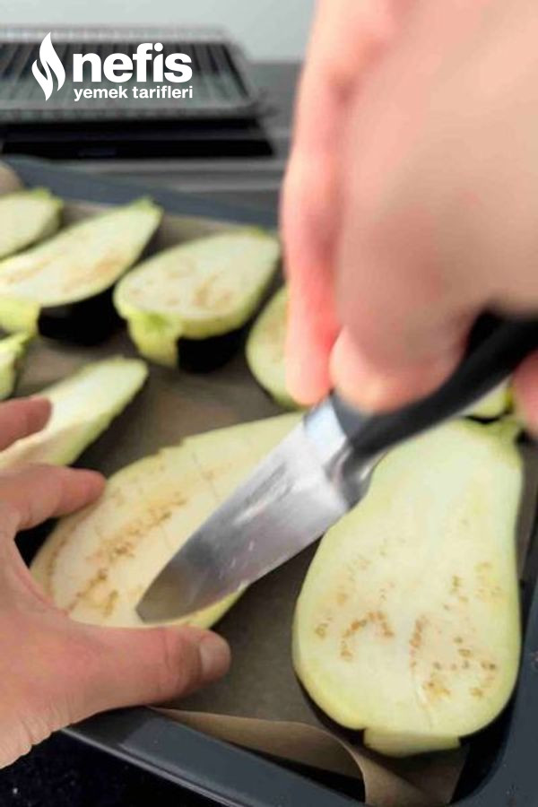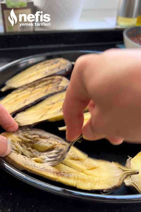 6. Fırında yumuşamış patlıcanların ortasını çatalla yavaşça ezin.