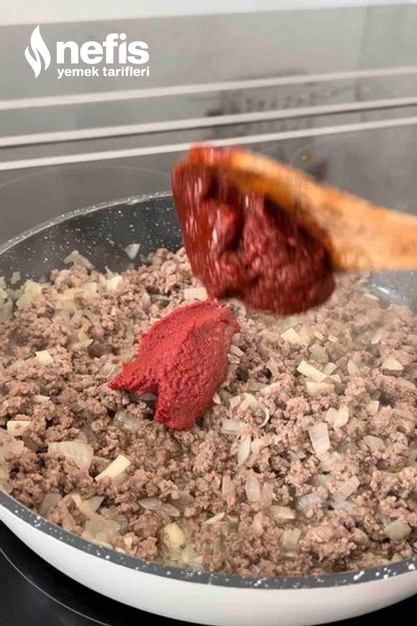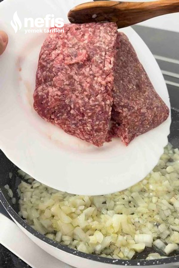 4. Ayrı bir tavada soğan ve sarımsağı kavurun, kıymayı ek edin.