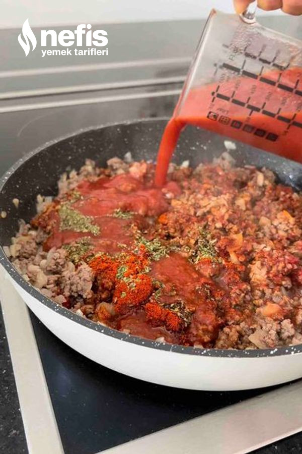 5. Daha sonra domates salçası, biber salçası, domates sosu ve baharatları ekleyip karıştırın.