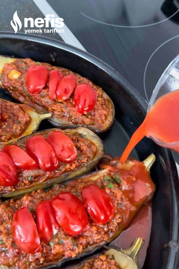 7. Hazırladığınız kıymalı harcı patlıcanların içine doldurun ve cherry domateslerle süsleyin.