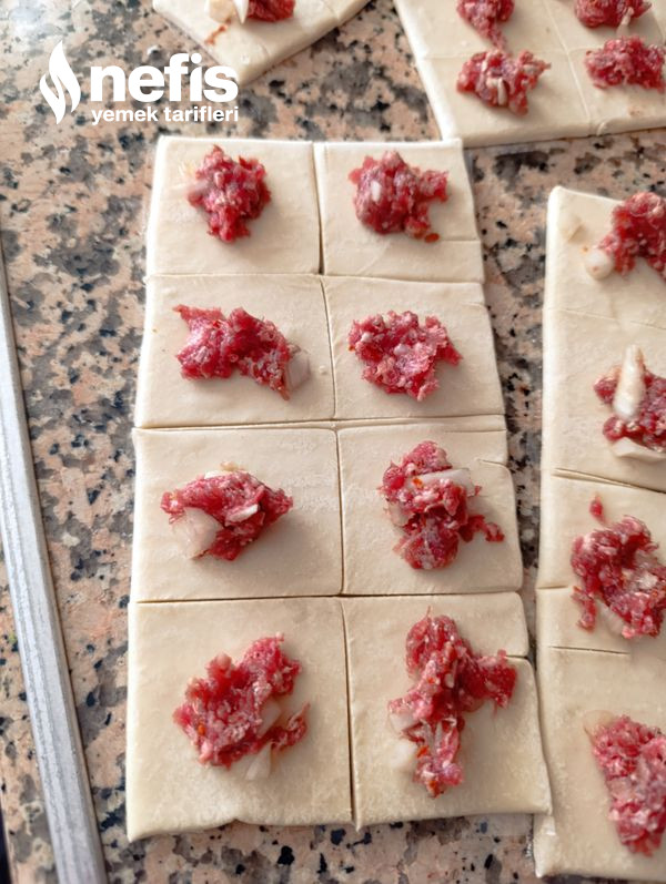 2. Milföyleri dörde bölelim kıymayı harcı minik minik ortalarına yerleştirelim .