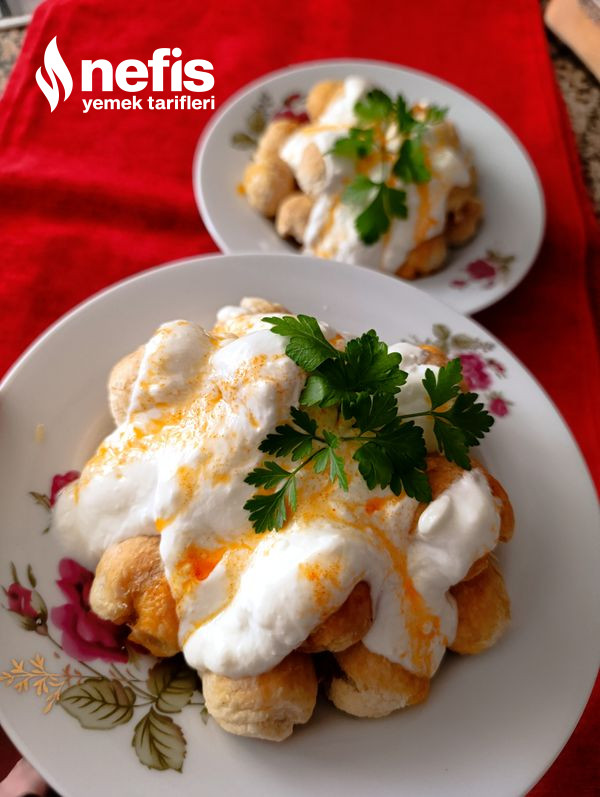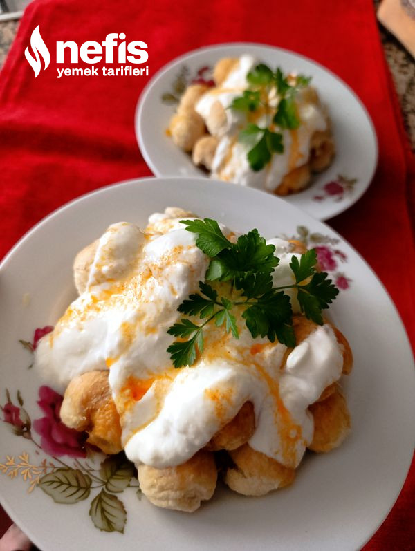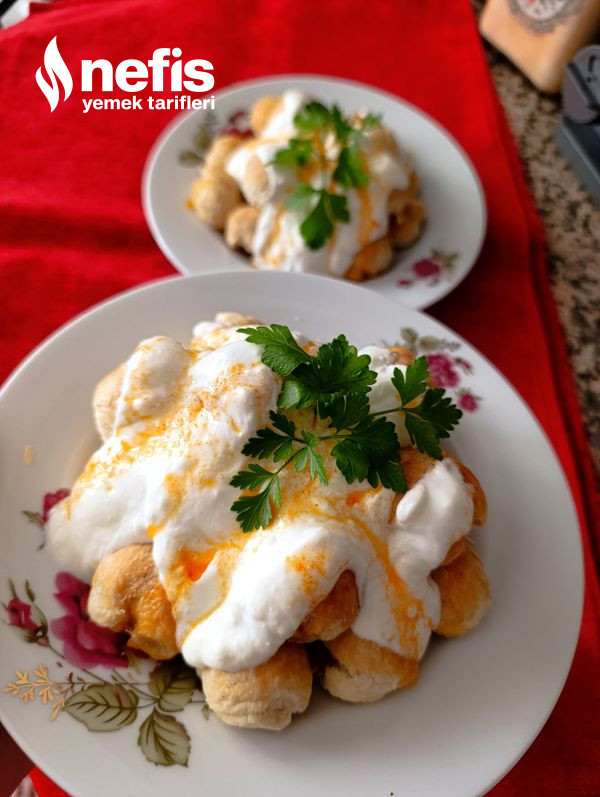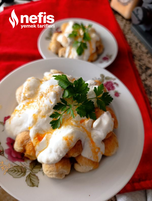 5. Fırından çıkınca tabağa alıp üzerine yoğurt serpelim, sıvı yağ ve toz biberi ocakta kızdırıp üzerine dökelim.