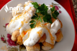 5. Fırından çıkınca tabağa alıp üzerine yoğurt serpelim, sıvı yağ ve toz biberi ocakta kızdırıp üzerine dökelim.