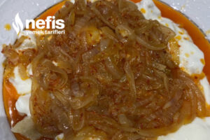 10. Köfteler piştikten sonra süzün ve yoğurtlu sosu tabağa ekle en son soğanlı sosu üzerine gezdirin.