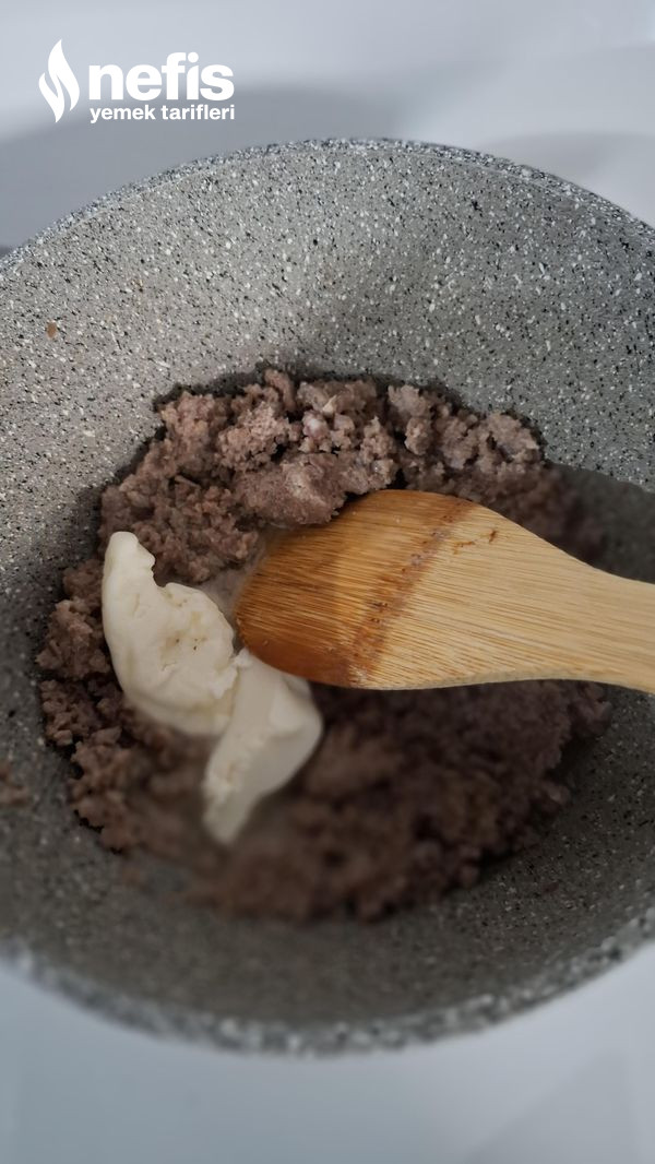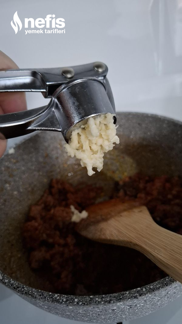 5. Karıştırdıktan sonra 2 diş sarımsağı ezip içine ek ediyoruz.