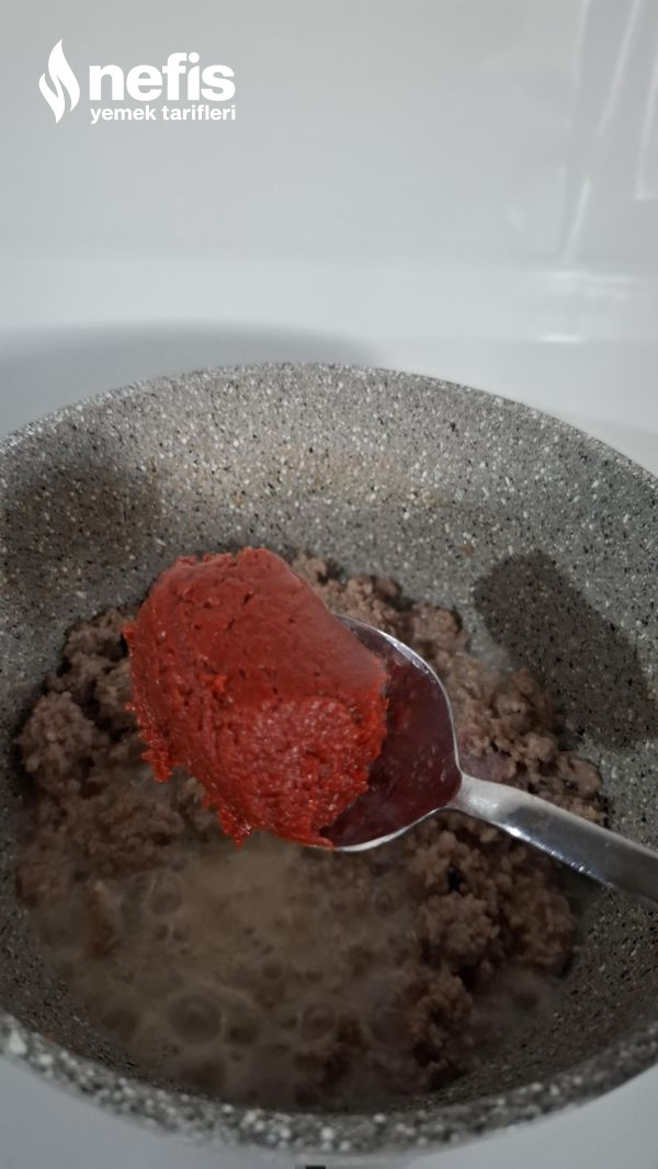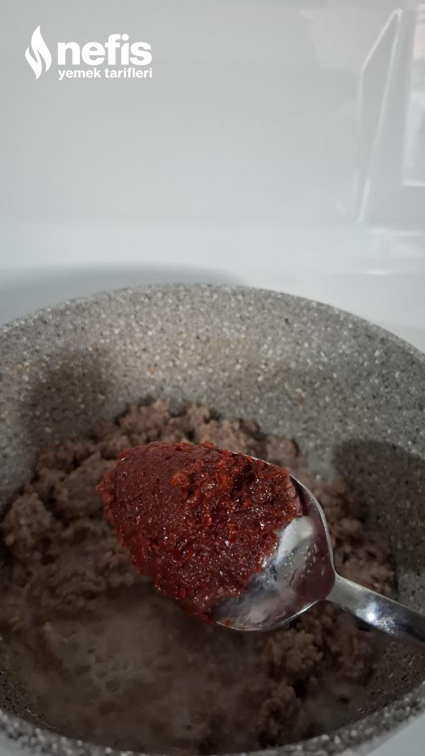 3. Kavurduktan sonra 1 yemek kaşığı domates salçası, yarım yemek kaşığı biber salçasını koyuyoruz.