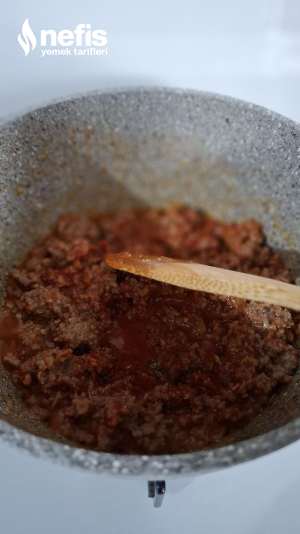 2. Makarnalar pişerken 1 yemek kaşığı tereyağını ve 2 yemek kaşığı sıvı yağ dökerek kıymamızı kavuruyoruz. (kurutmadan).