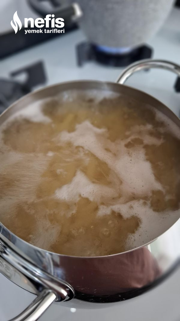 1. Makarnayı suyuna 1 yemek kaşığı tuz ve 1 yemek kaşığı sıvı yağ koyarak kaynatıyoruz.