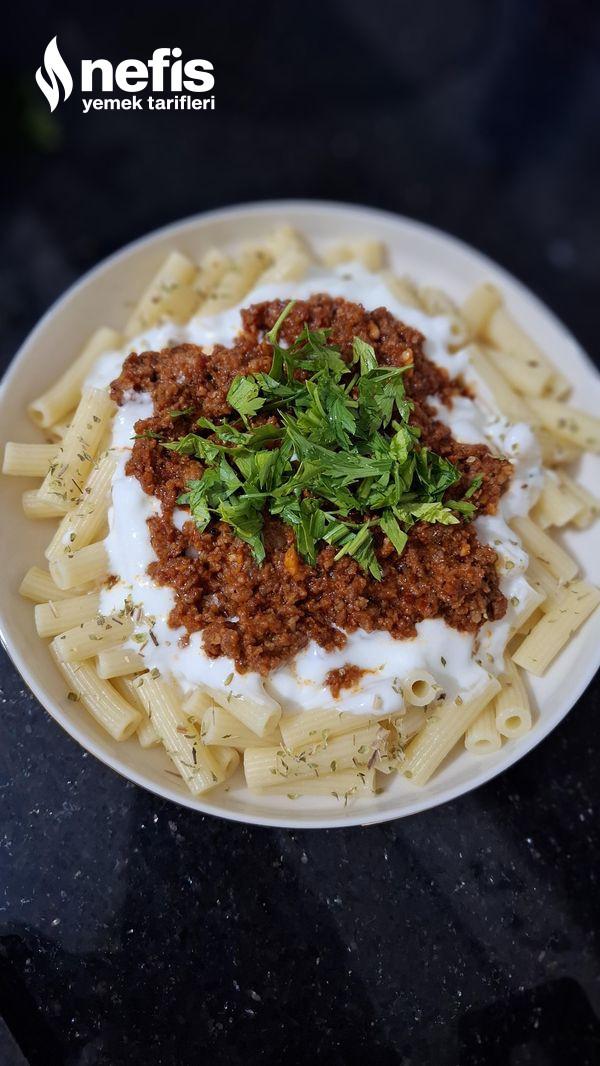 10. Makarnalarımızı tabaklara bölüştürüp üzerine yoğurt döküp sonrada kıyma sosumuzu döküyoruz.