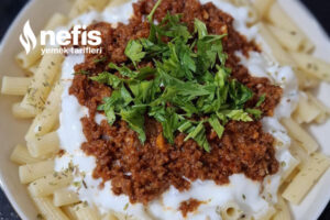 10. Makarnalarımızı tabaklara bölüştürüp üzerine yoğurt döküp sonrada kıyma sosumuzu döküyoruz.
