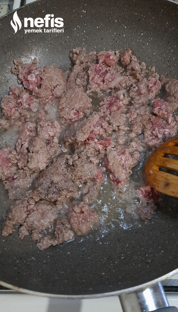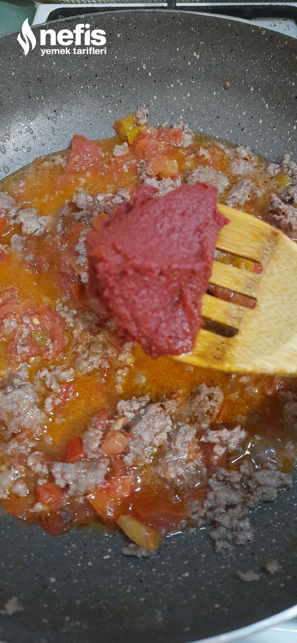 - Tavaya sıvı yağ konur biraz ısınınca kıyma eklenir. Kıyma piştikten sonra domates sosu, salça ve baharatlar eklenir. 15-20 dk orta ateşte pişirilir.