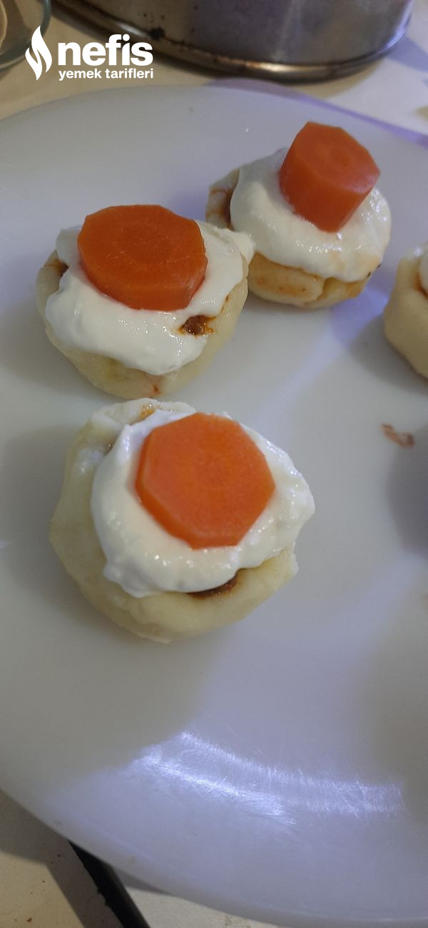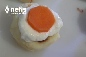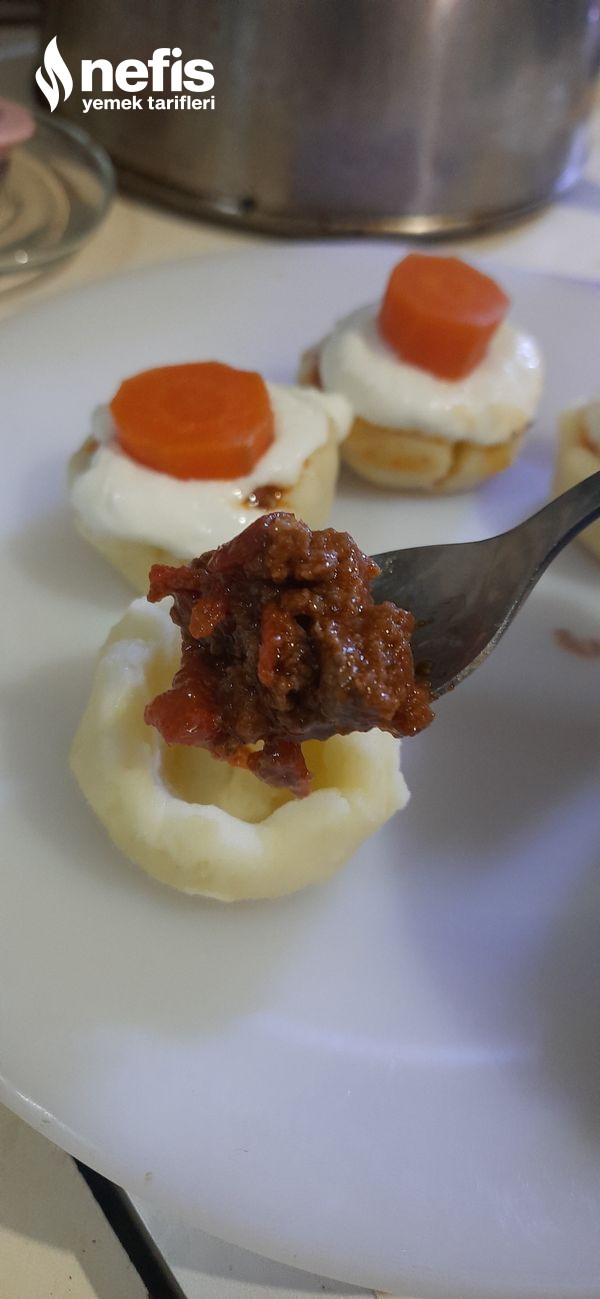 - Patateslerin ortasına kıymalı iç harcını tatlı kaşığı ile koyuyoruz. Üzerine yoğurt döküp ince doğradığımız havuçları koyuyoruz. İsterseniz üzerine dökmek için salçalı sos yapabilirsiniz.