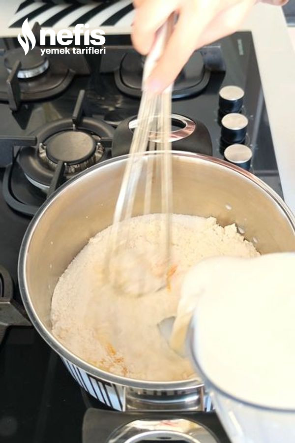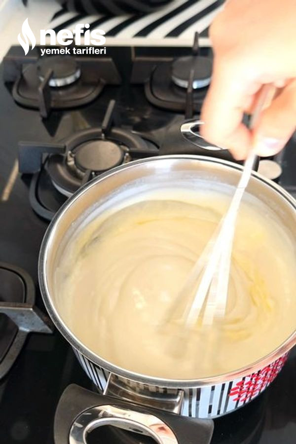- Muhallebi için; süt, un, nişasta, yumurta ve şekeri tencereye alın. Orta ateşte daima karıştırarak yoğunlaşana kadar pişirin. Ocaktan alınca vanilya ve tereyağını ekleyip karıştırın.