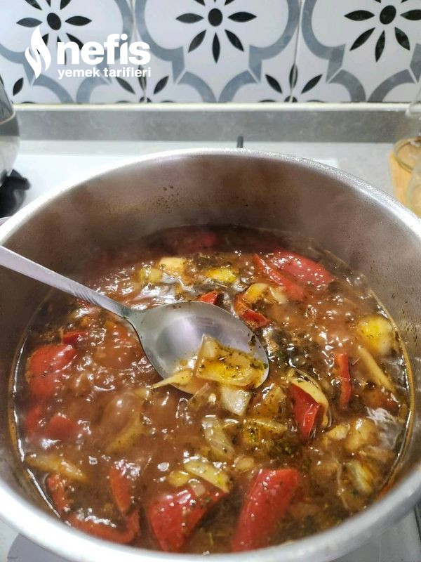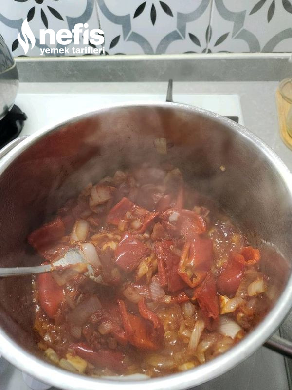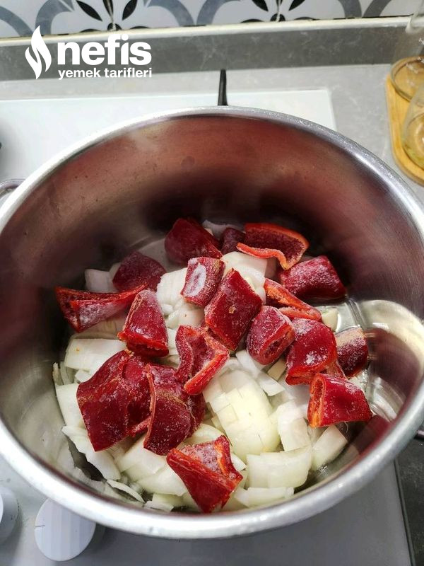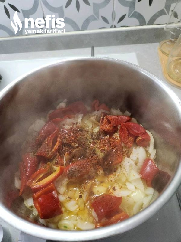 1. 1 tencerede sıvı yağ koyup2 adet doğradığımız soğan, sarımsakları ve biberi kavuruyoruz.