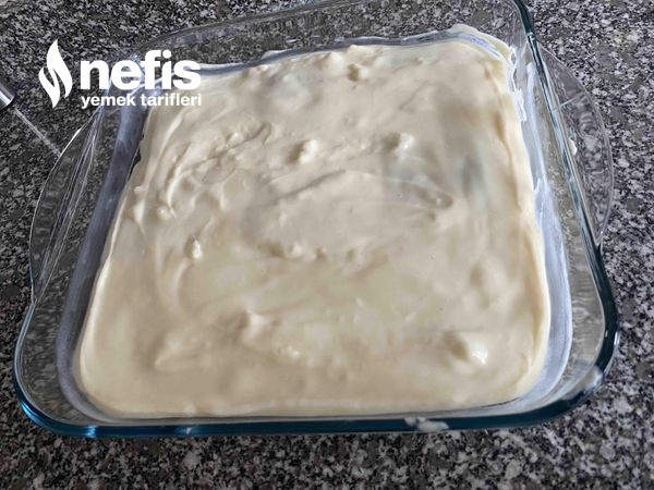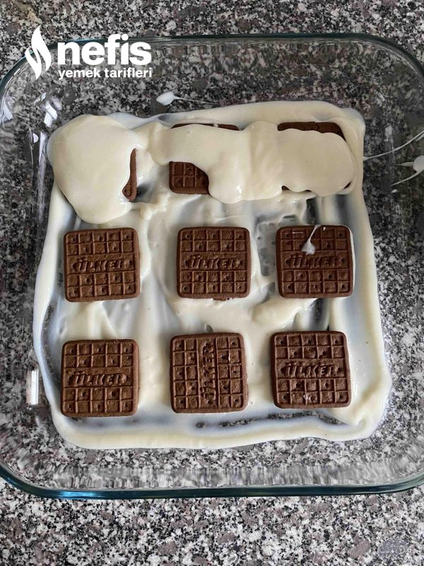 5. Kabımızın tabanına biraz muhallebi ekleyelim ve bisküvilerimizi dizelim. Üstüne muhallebi yayıp tekrar bisküvi ekleyip kalan muhallebi ile kaplayalım