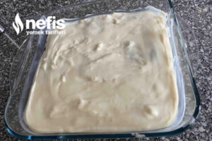 5. Kabımızın tabanına biraz muhallebi ekleyelim ve bisküvilerimizi dizelim. Üstüne muhallebi yayıp tekrar bisküvi ekleyip kalan muhallebi ile kaplayalım