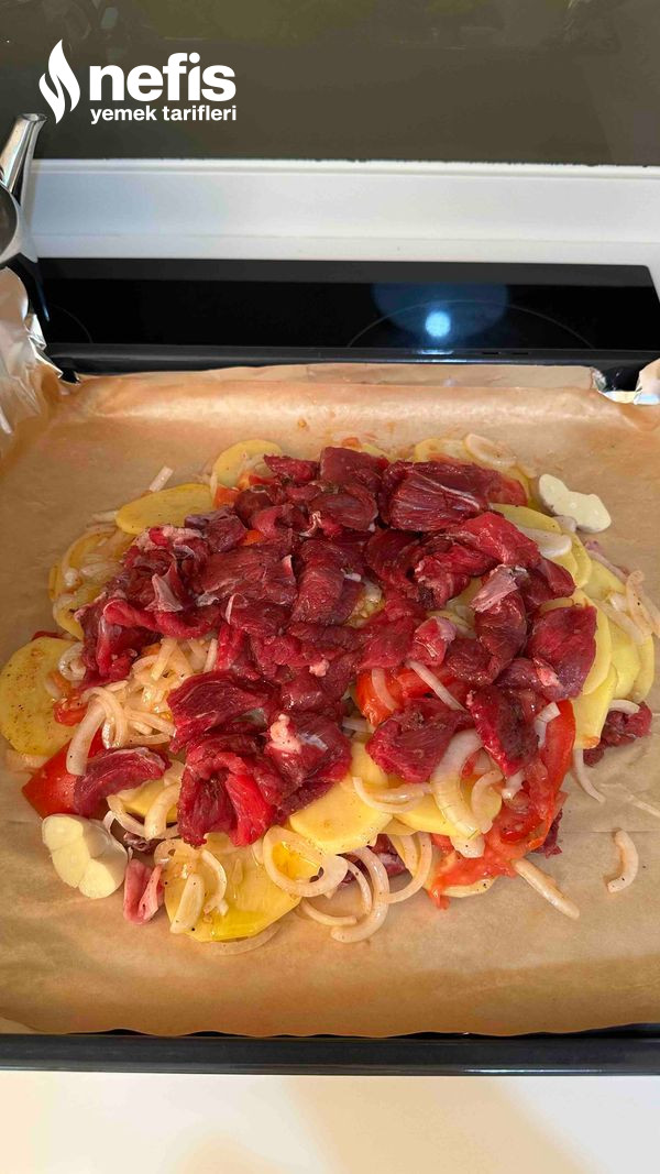 - Fırın tepsisine folyo, üzerine yağlı kağıt koyalım, birinci evvel bir ölçü et, üzerine sebzelerin yarısı ve sonra tekrar kalan etler ve sebzelerin geri kalanı olarak tepsiye alalım. Üzerine biraz daha zeytinyağı gezdirelim. Baş sarımsağı ortadan kesip tepsiye koyalım ve hava almayacak biçimde uygunca saralım.