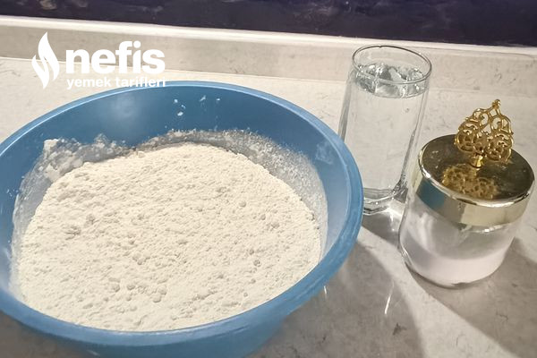 - Üzerine bir yemek kaşığı tuzu ekliyoruz ,bir çukur açarız içine 500 ml suyu ekleyip yoğuruyoruz kulak göğsünden biraz daha sert bir hamur elde etttikten sonra üstünü kapatıp buz dolabında 10 dk bekletiyoruz.