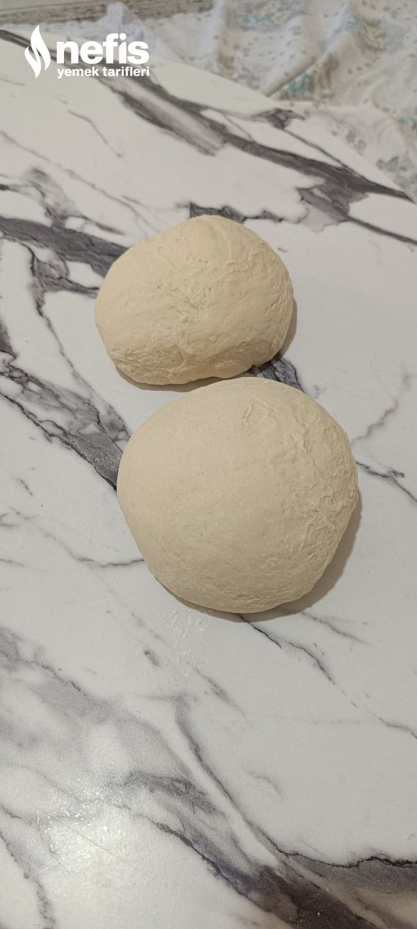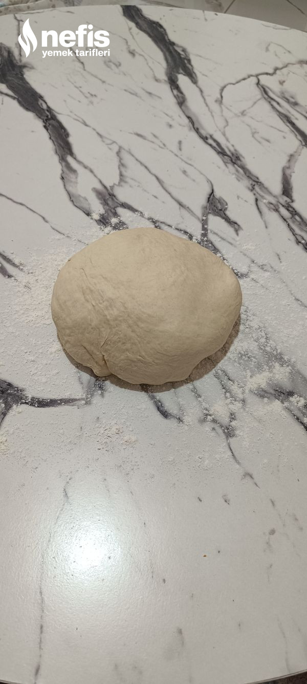 - Hamurumuz dinlendikten sonra dolaptan çıkartıp un serptiğimiz tezgahta yoğurduktan sonra iki bezeye bölüyoruz.