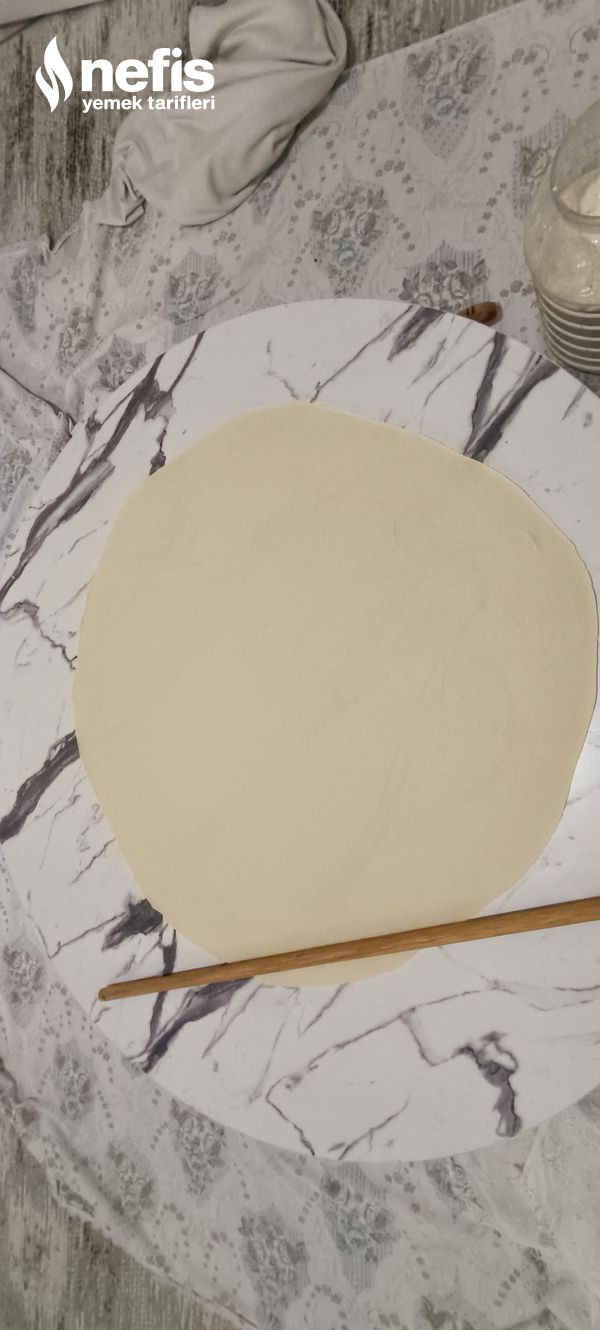 - Dinlenen bezelerimizi merdane yardımıyla açıyoruz daha sonra oklava ile ne çok kalın ne çok ince bir yufka açıyoruz .