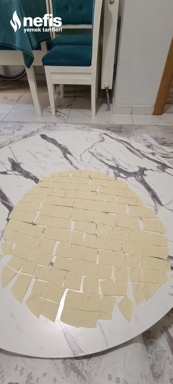 - Açtığımız yufkamızı fotoğraftaki üzere kesiyoruz ,kestiğimiz yaprak hengellerimizi kaynayan tuzlu suya atıyoruz ,yarım saat kaynatıyoruz hengellerimiz kaynayan suyun üzerine çıkınca yaprak hengellerimiz süzüyoruz.