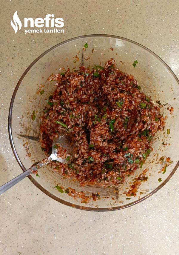 - İç harcı için pirinç, salçaları, limon tuzunu, yağsını, baharatlarını ve maydanozu ekleyip karıştırın harcımız hazır.