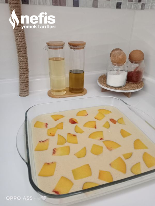 - Yağlanmış olduğumuz kare borcama kek harcımızı döküyoruz ve üzerine ne çok ince ne de çok kalın olacak biçimde. Şeftalileri dilimliyoruz.