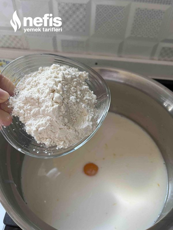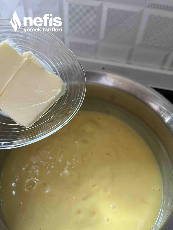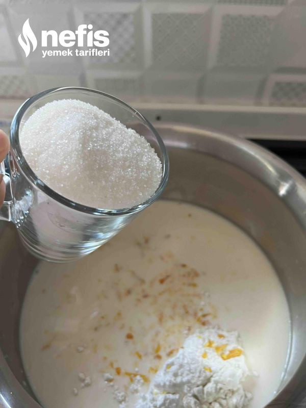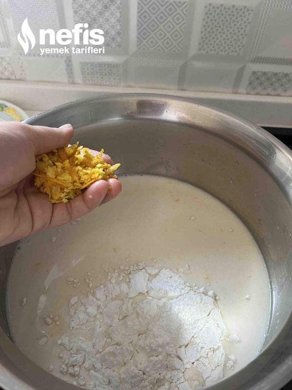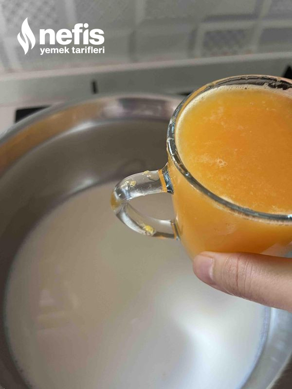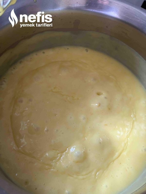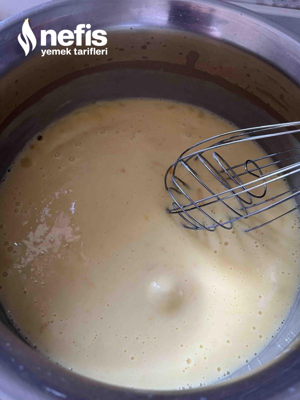 2. Bir tencereye süt, portakal suyu, şeker, un,nişasta ve yumurta sarısı ve portakal kabuğu eklenerek daima karıştırılır.