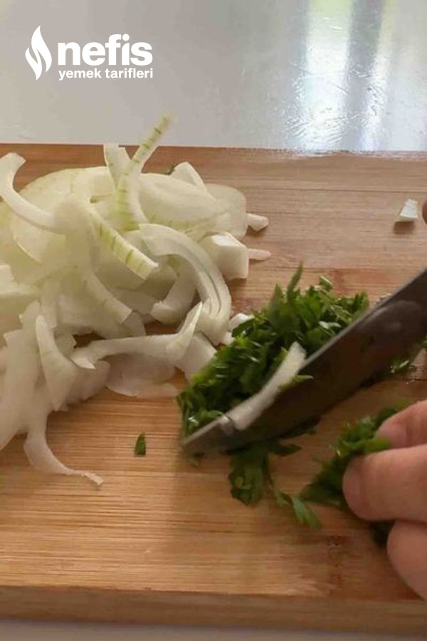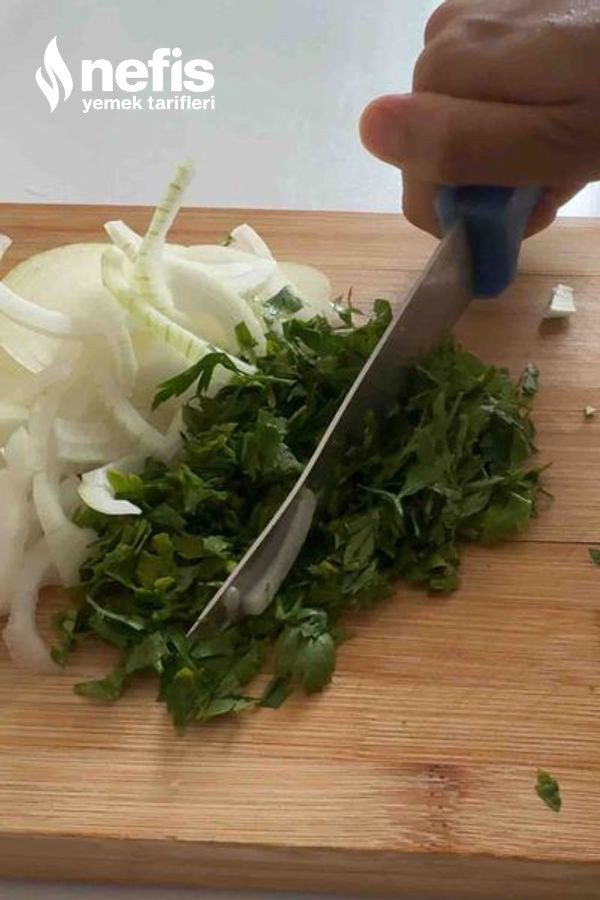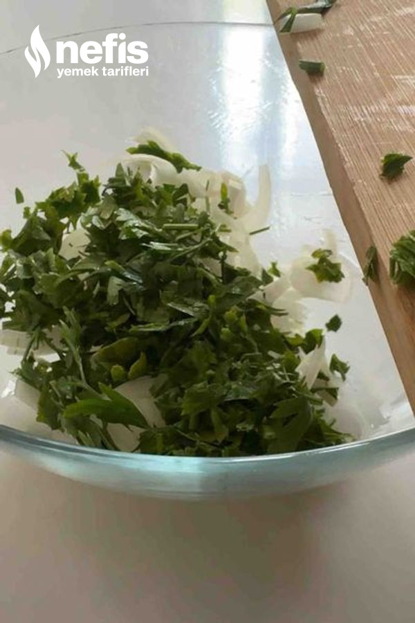 - Soğanlı piyazlık doğrayalım, maydanozu ince ince doğrayalım, soğanla birlikte karıştırma kabına alın.
