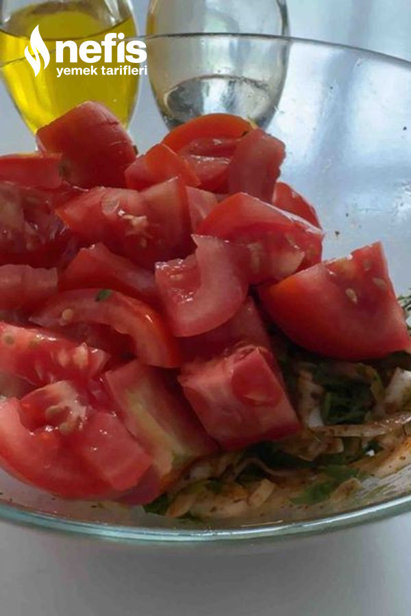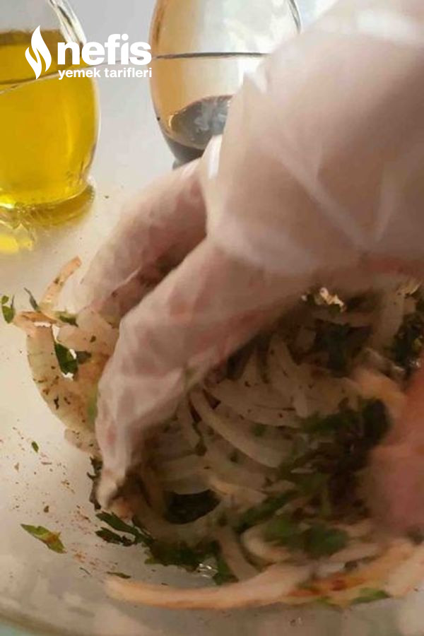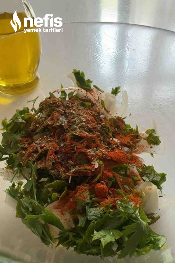 - Üzerine tuz ,kekik ,toz biber ,nane ,nar ekşisi ve zeytinyağı ekleyip elinle düzgünce ovalım.