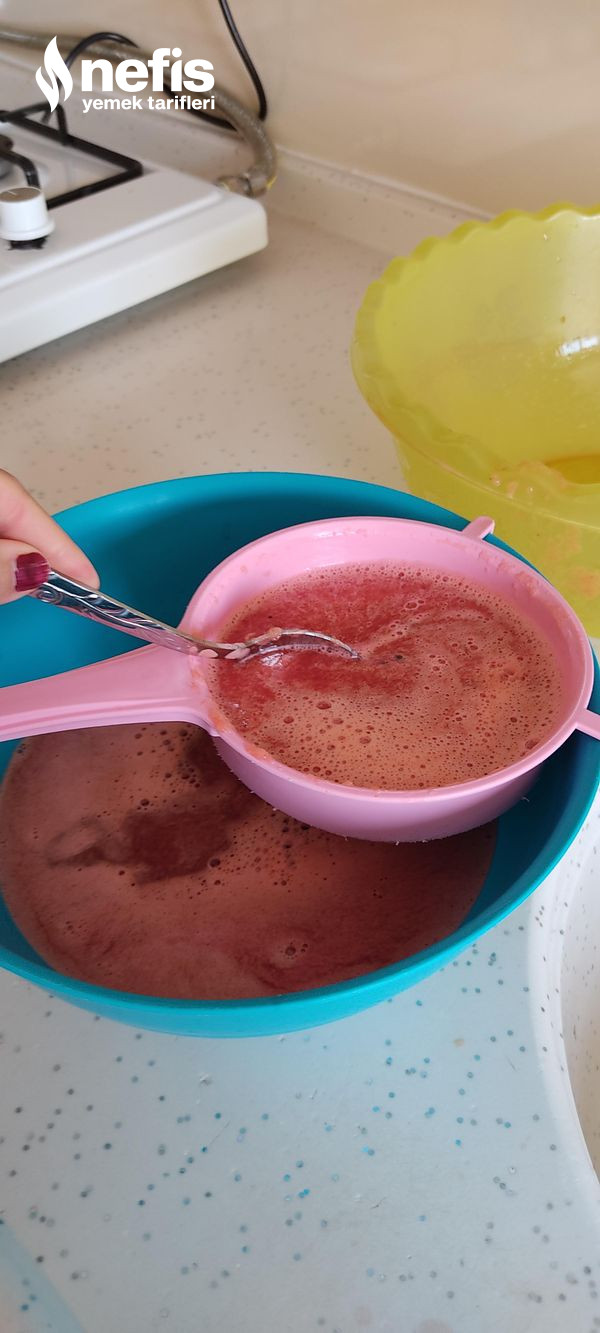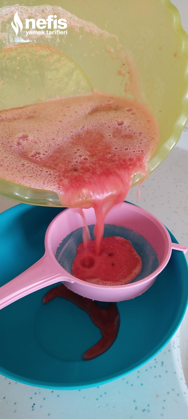 3. Blenderdan geçirdiğimiz karpuzları ince bir süzgeçten geçirelim ve posasını alalım.