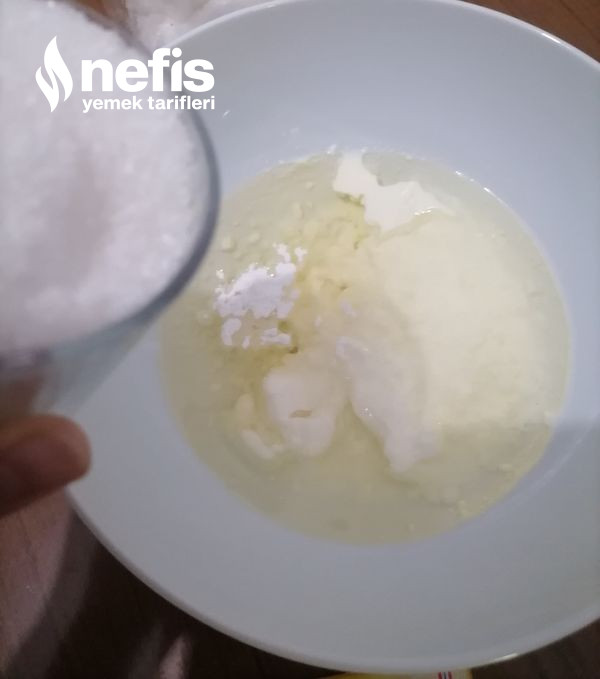 1. Derin bir kabın içerisine yoğurt, şeker, vanilya ve sıvı yağı alıp güzelce karıştıralım.