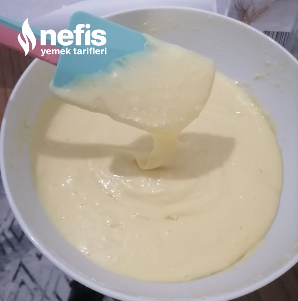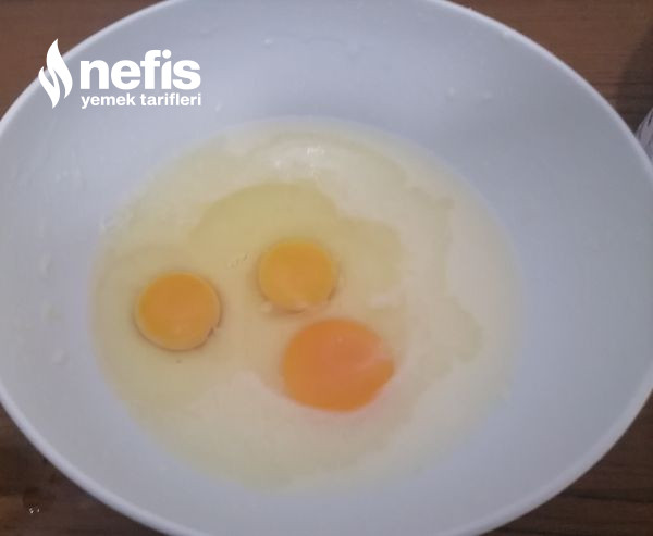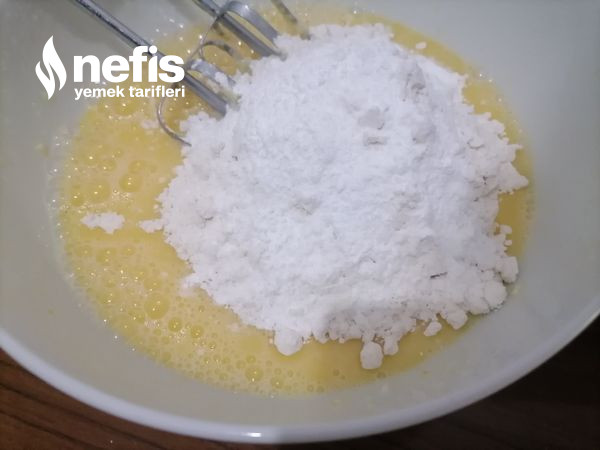 3. Kalan harca 3 yumurta ekleyip 2 dakika mikserle çırpalım. Kabartma tozu ve ununu da ek edip yağlı kağıt serdiğimiz yuvarlak borcama dökelim.
