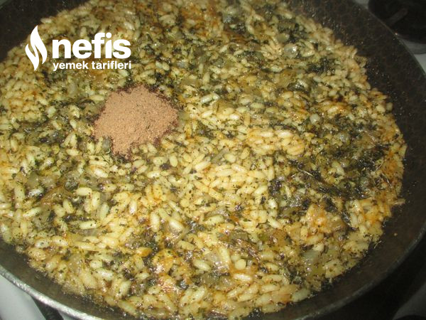 2. Yenibahar hariç olarak karıştıralım bir bardak su döküp karıştıralım. Suyu fokurdayıncaya ocağın altını kısalım, kısık ateşte suyunu çekene kadar pişirelim. En son yenibahar serpip karıştıralım.