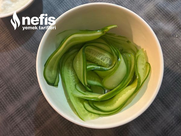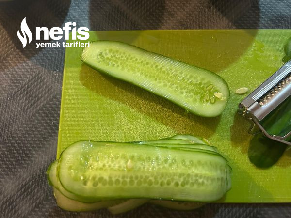 1. Salatalığı yeterlice yıkayıp bir kabuk soyma aparatı ile ince ince kesiyoruz.