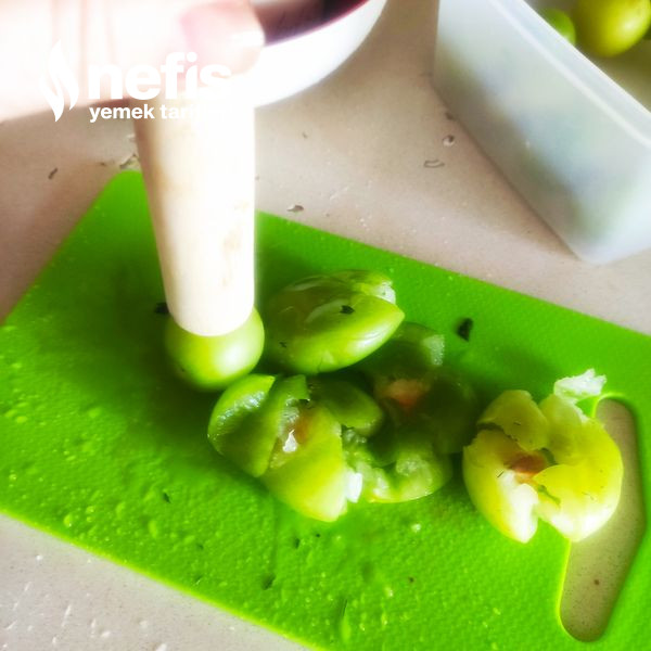 2. Daha sonra içine tek tek yeşil erikler atılarak taş ya da tokmakla üzerine hafif hafif vurarak suyu ve çekirdeği çıkarılır.