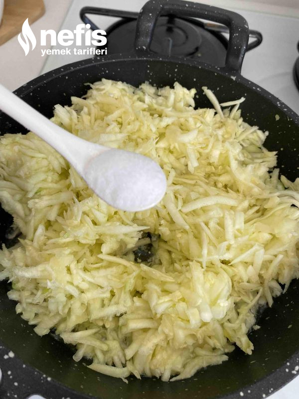 - Daha sonra rendelediğimiz kabakları az zeytinyağlı tavaya alalım ve tuz ekleyerek kavuralım. ( 5 dakika) ocaktan alalım ve soğumaya bırakalım.