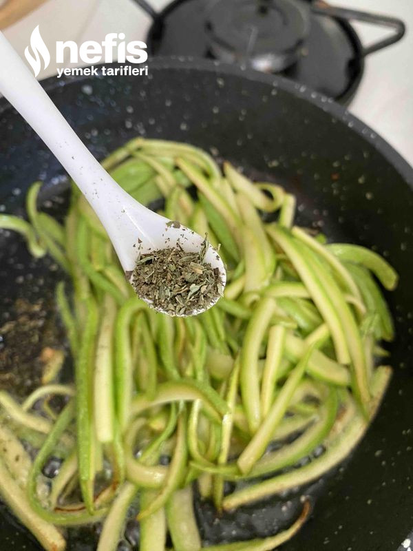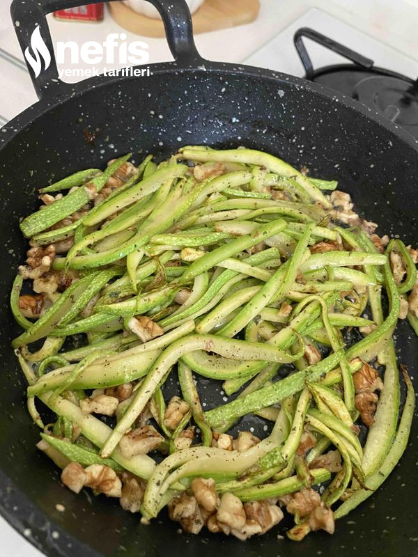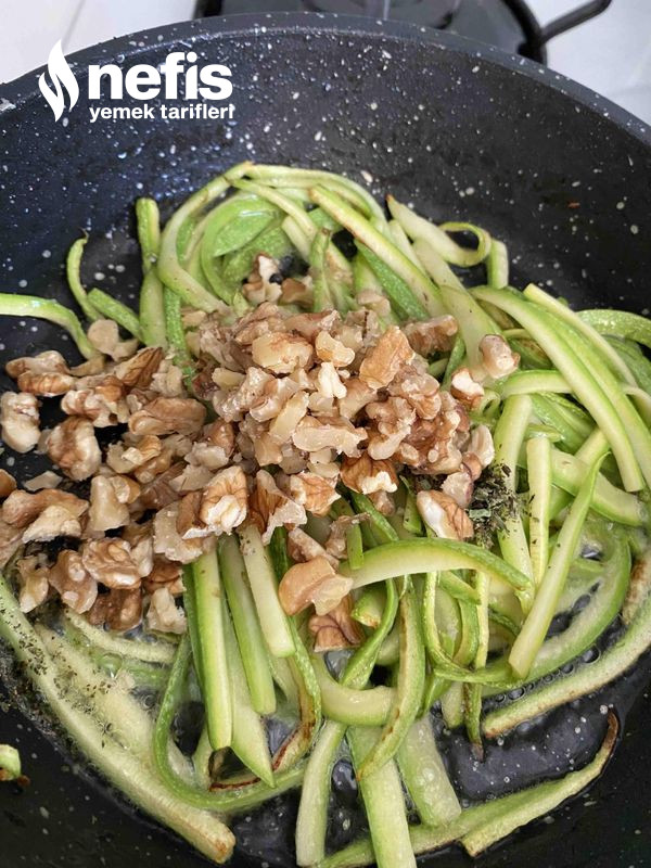 - Başka bir tavamıza ince ince doğradığımız kabakları tavaya alalım zeytinyağ ile kavuralım üzerine ceviz içi ve nane ekleyip pişirelim 3-5 dakika.