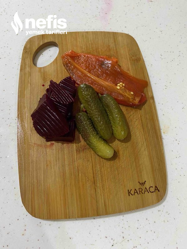 1. Bir kaba yeşil mercimeği, haşlanmış mısır tanelerini, rendelenmiş havucu, güzelce ufalttığımız maydanoz ve soğanımızı, doğradığımız pancar ve kornişon turşumuzu alalım.