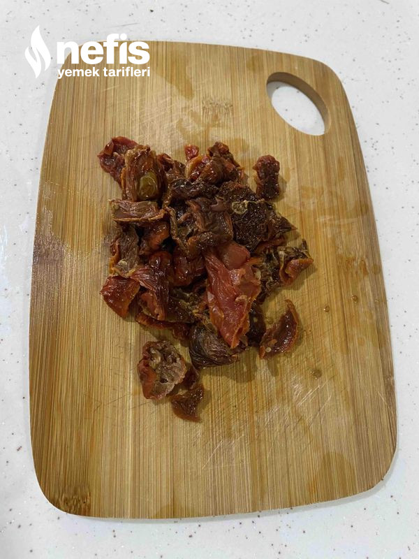 2. Yumuşaması için ılık suda beklettiğimiz kuru domateslerimizi doğrayıp ekleyelim.