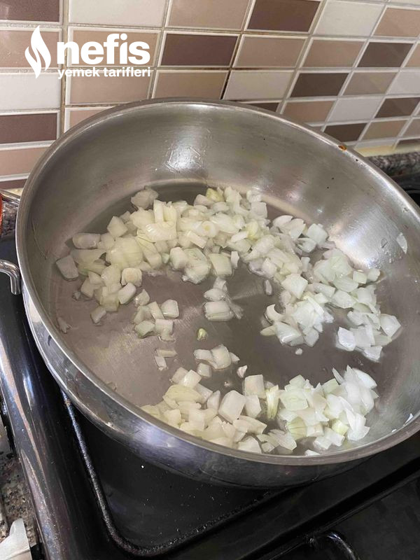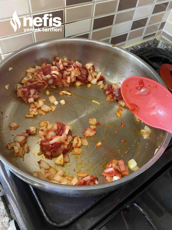 1. Soğanları küp küp kesin, 2 yemek kaşığı sıvı yağ ile kavurun kavrulunca salçayı ekleyin.