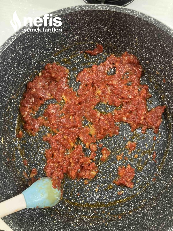 3. Üzerine salçayı ekleyip kavurmaya devam ediyoruz bu basamakta bulyonu ekliyoruz eritiyoruz.