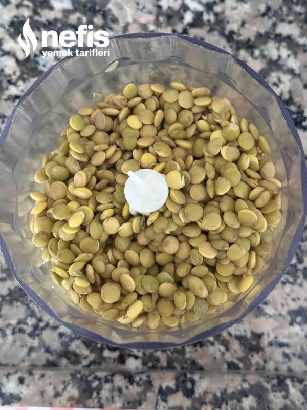 1. Öncelikle yeşil mercimeği yeterlice yıkayıp bir gece öncesinden suda bekletelim. Sonraki gün süzelim ve mutfak robotuna dökelim.